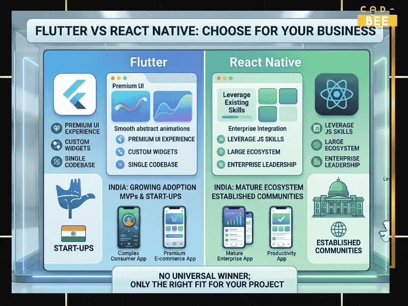📍 Local Context (India / Chandigarh): In the Indian market, the demand for both frameworks is high. The availability of developers for React Native is greater because of the popularity of the JavaScript language. However, Flutter has begun to take off in the fintech, edtech, and e-commerce app development fields. This is especially true for startups that desire a more premium UI for lower cost.